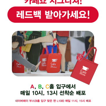 “저 빨간 가방 어디서 받나요?” 궁금했던 그 가방, 바로 여기서 만나요! 카페쇼 현장에서 시그니처 레드백을 나눠드립니다! 배포 시간 매일 10:00 / 13:00 (선착순 한정) 배포 장소 A, B, C홀 입구 또한, 공식 스폰서 네이버페이 부스(B홀 입구 맞은 편 L108)에서도 11:00 / 15:00 타임에 레드백 수령이 가능합니다. 시그니처 레드백, 놓치지 말고 받아가세요 [The 24th Seoul Int’l Cafe Show] Nov. 19-22. 2025 Coex, Seoul, Korea h. www.cafeshow.com i. www.instagram.com/seoulcafeshow f. www.facebook.com/cafeshowseoul l. linkedin.com/showcase/cafeshowseoul b. blog.naver.com/cafeshow
