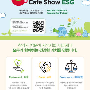 올해도 서울카페쇼는 글로벌 커피 비즈니스 플랫폼으로서, 지속가능한 미래를 위한 ESG 전시 운영에 앞장서고 있습니다. 참가사, 방문객, 지역사회, 그리고 미래세대까지—모두가 함께 만드는 건강한 가치, 카페쇼가 함께 이어갑니다. Environment | 환경 친환경 전시 운영과 제로 웨이스트 정책을 통해 지구를 위한 실천을 전시장 곳곳에서 이어가고 있어요. Social | 사회 청년 바리스타와 소상공인을 응원하며, 지역사회와 함께 성장하는 다양한 프로그램을 펼치고 있습니다. Governance | 지배구조 투명하고 윤리적인 운영으로 더 신뢰받는 전시를 만들어가고 있습니다. 지속가능한 MICE 산업, 그리고 글로벌 커피 산업의 미.......