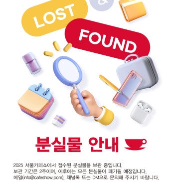 2025 서울카페쇼에 방문해 주셔서 감사합니다❣️ 관람 중에 분실하신 물건을 사무국에서 보관하고 있습니다. ✅보관 기간: 2025년 12월 11일까지 *보관 기간이 만료된 후에는 모두 폐기 처리됩니다. ✅분실물 목록: 하늘색 지갑, 목도리, 외투, 모자, 구매품(밀크티, 콜드브루), 안경, 보조배터리 등 *저희에게 분실물 접수된 신분증은 반송처리 될 수 있도록 모두 우체통에 넣어드렸으니 참고해주세요! [The 25th Seoul Int’l Cafe Show] Nov. 11-14. 2026 Coex, Seoul, Korea h. www.cafeshow.com i. www.instagram.com/seoulcafeshow f. www.facebook.com/cafeshowseoul l. linkedin.com/showcase/cafeshowseoul b. blog.naver.com/cafeshow