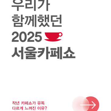커피 한 잔이 만든 연결의 순간 ☕ 지난 11월, 2025 서울카페쇼가 성황리에 막을 내렸습니다. 커피 한 잔을 매개로 전 세계의 사람과 아이디어가 오갔던 현장, 생생한 순간들을 다시 만나보세요. 하이라이트 영상 → 바로 보기 영상 속에서 커피 한 잔으로 연결된 순간들을 다시 느껴보세요 ✨ 결과보고서 → 바로 보기 행사 주요 성과와 다양한 통계, 트렌드를 정리한 자료도 확인하실 수 있습니다. 그리고 벌써부터 기대되는 2026 서울카페쇼! 2026년 11월 11일(수) ~ 14일(토) 더 풍성한 경험과 새로운 만남으로 찾아올 제25회 서울카페쇼도 기대해주세요 커피로 연결된 아이디어와 영감, 그리고 사람과 사람을 이어.......