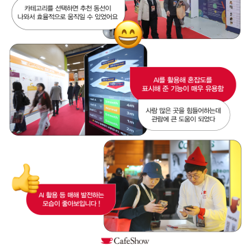 Cafe Show X 한국관광공사 2025 서울카페쇼는 AI 기술을 도입하여 스마트 전시의 새로운 기준을 제시했어요. ️더 똑똑한 AI 지도 더 섬세한 AI 디지털휴먼 ♀더 쾌적한 관람을 위한 AI 밀집도 분석 더 정확한 AI 다국어 통역 더 지속가능한 스마트 ESG 까지 전시는 더 스마트하게, 경험은 더 새롭게. 커피 그 이상의 가치를 만드는 서울카페쇼의 혁신은 2026년에도 계속됩니다 https://www.instagram.com/seoulcafeshow/ 함께 만드는 2026 월드커피리더스포럼! 여러분의 의견을 들려주세요 설문 바로가기 https://docs.google.com/forms/d/e/1FAIpQLSdjmER1giLfFNBlkdnh6Qo5ia3S1Lth-UX-6x50HKaNWiGaNQ/viewform [T.......
