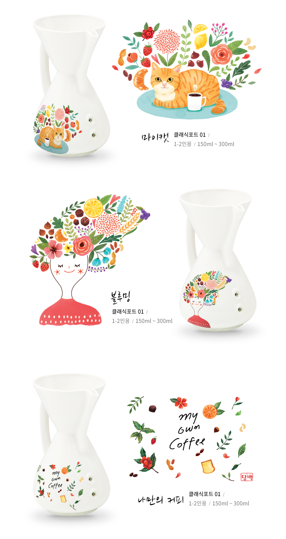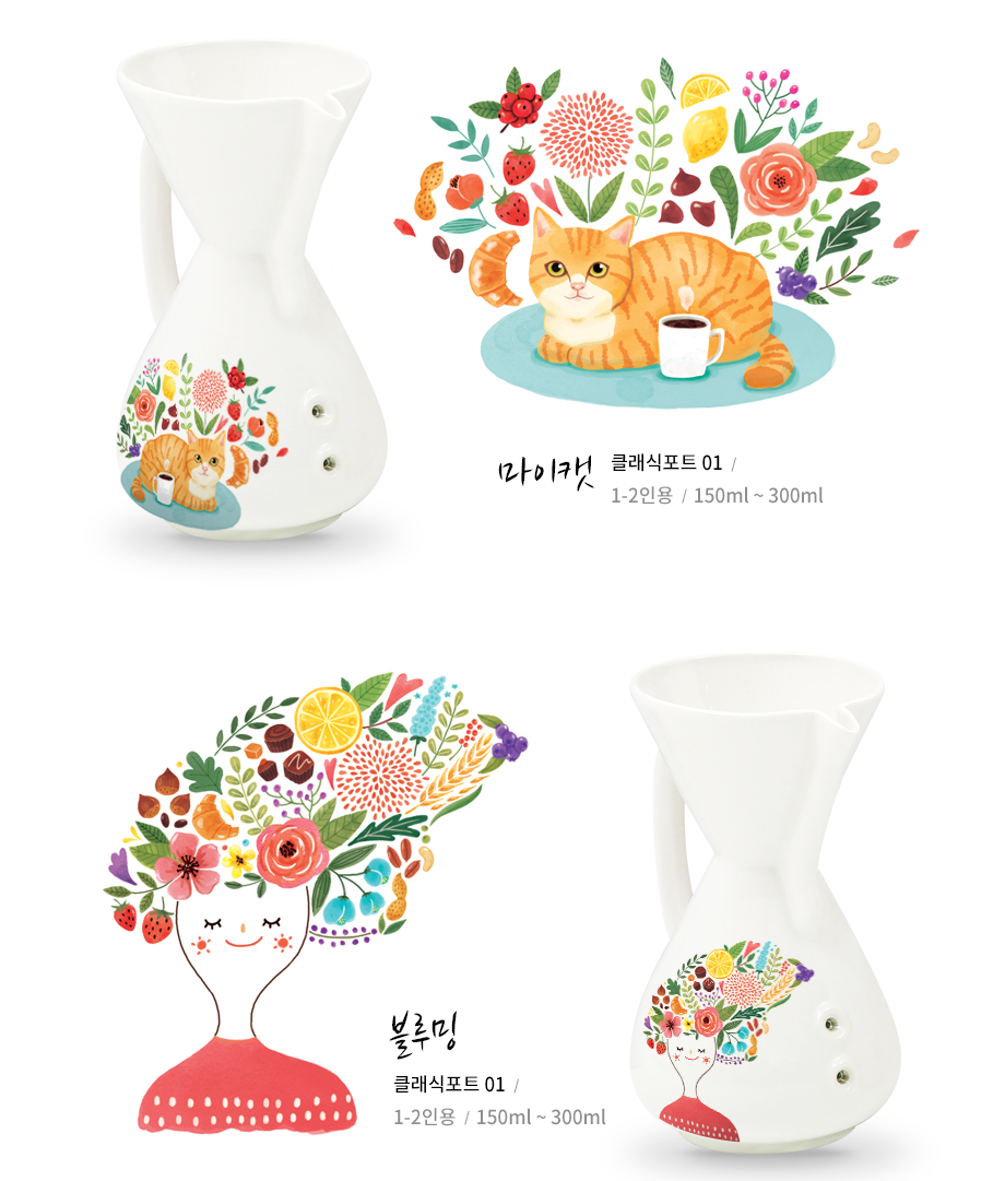 일러스트레이션 작가 "담백"님의 일러스트와 콜라보레이션으로 출시된 "마이캣, 블루밍, 나만의 커피" 시리즈의 세라페 클래식 포트를 카페쇼에서 만나 보세요