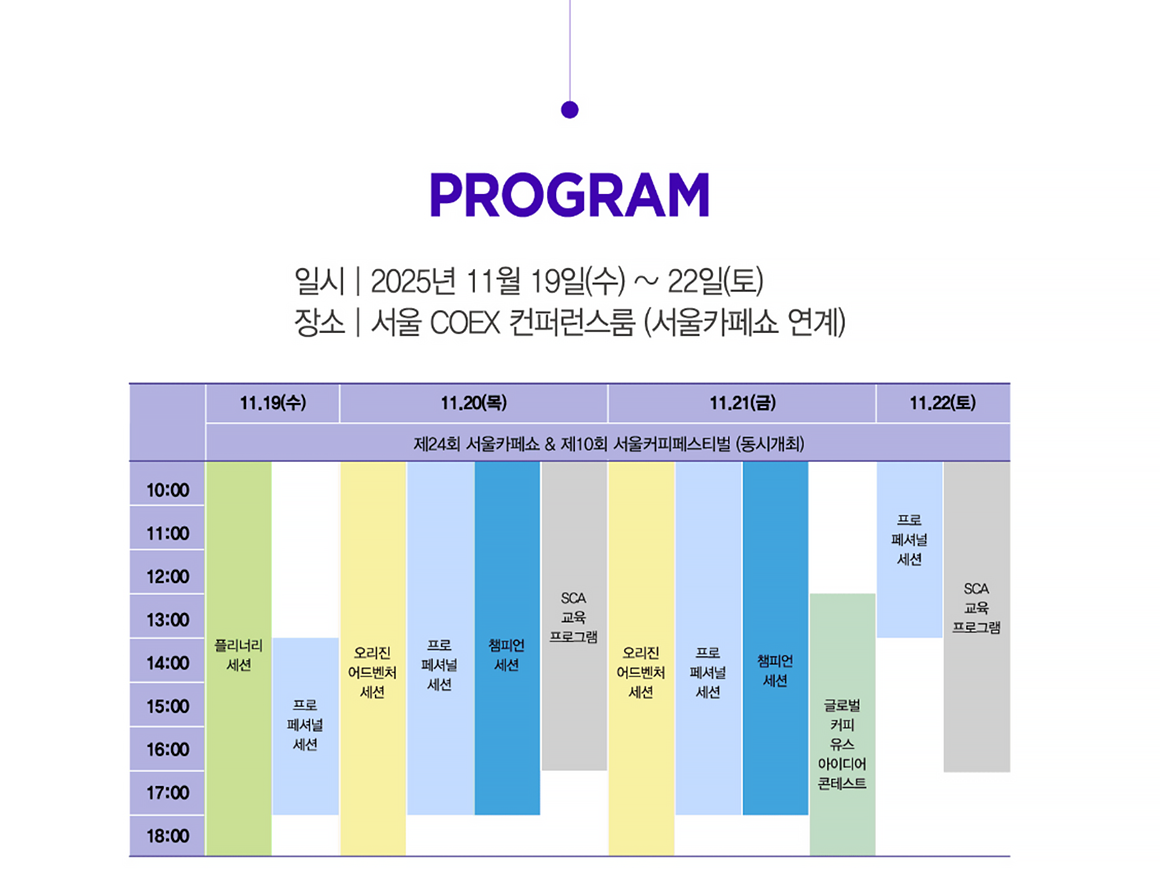 제14회 월드커피리더스포럼은 '미식 경험의 설계자들'이라는 주제로 맛과 공간, 문화와 철학을 연결하는 새로운 비전을 제시합니다. 이번 포럼에서는 '한 모금, 한 입이 전하는 기쁨을 설계하는 사람들'의 이야기를 통해 감각적 경험이 어떻게 하나의 산업으로 발전하는지 살펴봅니다. 커피 업계 전문가들과 함께 브랜딩, 공간 설계, F&B, 문화 등 다양한 분야의 글로벌 리더들이 한자리에 모여 각자의 철학과 인사이트를 나누며, 각자의 비전이 산업 전체의 새로운 흐름을 만들어가는 순간을 함께 만들어갑니다. |