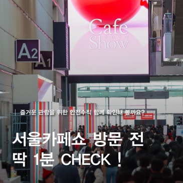 ☕ 안전은 필수! 즐거운 전시 관람의 첫걸음입니다 서울카페쇼를 더 재미있고 편안하게 즐기기 위해, 우리 모두가 기억하면 좋은 관람 매너와 안전 수칙들을 소개합니다. 작은 배려 하나가 모두의 즐거움을 지켜준다는 사실, 잊지 마세요! 참관객부터 참가업체, 주최사까지! 카페쇼에 참가하는 모두가 안전할 수 있도록, 집중해주세요. 참관객 필수 체크리스트 편안한 복장과 신발 준비 | 편하게 입고, 편하게 걷고! 전관 관람을 위한 준비 완료! 전시장 구조도와 비상구 위치 확인 | 비상 상황에도 당황 NO! 구조도, 비상구 체크는 필수입니다. 혼잡 시간 피하기 | 오픈, 마감 시간을 피하고 여유있게 전시를 즐겨보세요. 질서있는 행.......