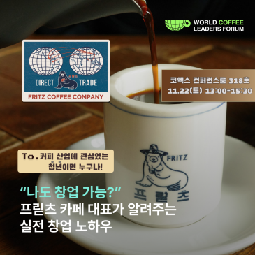 ☕️ “나도 커피 창업 가능?” 프릳츠 커피 대표가 직접 알려주는 실전 창업 노하우! 커피 산업에 관심 있는 청년이라면 절대 놓칠 수 없는 기회 11월 22일(토), 프릳츠커피컴퍼니 김병기·박근하 대표가 월드커피리더스포럼 커피에 진심인 청년 여러분을 만나러 옵니다! 이번 토크콘서트에서는 프릳츠 커피의 창업과 성장 스토리, 고객 중심 서비스를 기반으로 한 브랜드 차별화 전략, 그리고 카페와 베이커리의 새로운 결합에서 얻은 경영 인사이트까지 프릳츠만의 성공 비법과 철학을 생생하게 전해드립니다. 또한 커피 업계에서 느낀 현실적인 고민과 도전의 순간들까지 예비 창업가로서의 궁금증과 진로에 대한 고민을 두 대표들과 자유.......