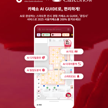 Cafe Show X 한국관광공사 카페쇼 AI GUIDE 카페쇼가 일주일 앞으로 다가왔습니다! 이번 서울카페쇼는 단순한 전시가 아니에요 — AI와 함께하는 스마트한 커피 여행이 시작됩니다! 올해, 그 어느 때보다 똑똑하고 흥미롭게 즐길 준비 되셨나요? 카페쇼 AI GUIDE와 함께라면, 당신의 카페쇼는 완벽해집니다. 전시장 안에서 길을 헤매거나, 내가 보고 싶은 부스를 놓친 적 있으신가요? 이제 그런 걱정은 끝! ‘카페쇼 AI GUIDE’는 AI 지도, 통역 등 다양한 기술이 한데 모인 똑똑한 전시 안내 솔루션이에요. ️ AI 지도 서비스 AI 지도가 여러분을 실시간으로 안내합니다. 부스 위치와 편의시설, 이동 동선은 물론, AI가 분석한 나의 관심 분.......